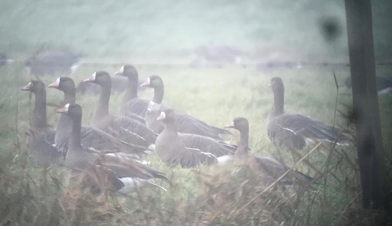 Op onderstaande foto zie je een groep kolganzen waarvan er één gans een halsring draagt. Ganzen hebben korte poten en liggen vaak, vandaar dat het aanbrengen van een ring om de hals in dit geval het handigst is.