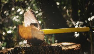 Wanneer je de bijl naar beneden zwaait, glijdt de hand die je onder de kop had richting de hand aan de onderkant van de steel. Door deze beweging kun je de bijl sturen. Zorg ervoor dat de bijl altijd in het midden van het te hakken houtblok eindigt. Voor de juiste slag kun je altijd eerst een aantal keer oefenen voordat je met volle kracht zwaait. Raak het midden van het houtblik en het blokje splijt - als het goed is - door tweeën.